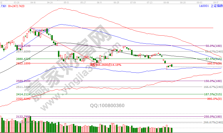 9號大盤最高點2808點(測算反壓2808一點不差),最低點2770點(測算支撐2772,僅相差2點),20年來贏家江恩大勢分析均是通過系統(tǒng)工具規(guī)則提前測算,歷史上重要時間、價格拐點都做有判斷,預(yù)判未來市場最有效的方法就是研究歷史。再談行情,下跌趨勢已確認,這在月初已闡述過,未來市場重要的時間參考點是9月、空間位置是月線藍色下軌線(學員通過極反通道工具獲取位置),這個觀點是7月中下旬公開課中有講過,當前這里定性的是反抽(級別很小,反彈都稱不上),保持6號觀點空間上看2744-2822,時間上9、16號,8號分析中談到價格需要等待時間,本周需要觀察等待期是以時間換取還是空間換取,因為級別太小,信號持續(xù)度隨之減弱,周初繼續(xù)觀察日線藍色下軌線支撐。8月12號盤中壓力是180度2800點、135度2786點,盤中支撐是45度2757點、0度2743點,日線時間窗口是16號。操作策略,指數(shù)生命線下弱勢區(qū)域運行,藍色下軌線震蕩,激進者最多3成倉交易,穩(wěn)健者空倉休息。