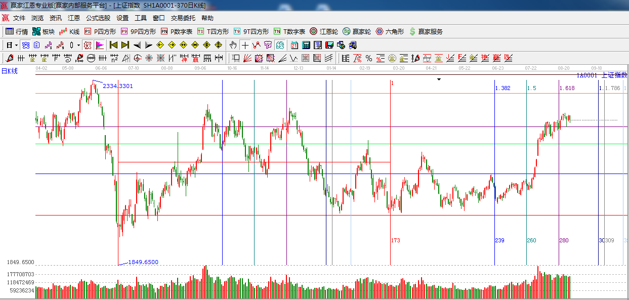 ★依據(jù)贏家江恩系統(tǒng)波段百分比提示:破位180度支撐線2232點,下方支撐江恩120度是2204點,六角形90度角度線支撐2210一線。
