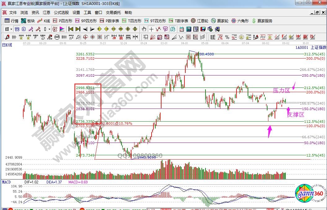 ☆依據贏家江恩理論系統(tǒng)波段百分比延伸線提示:以2440點為起點,2703點為終點做圖,指數(shù)盤中再探240度2878點支撐后止跌,下周關注此線得失,站穩(wěn)向上則看到0度2966點,向下?lián)羝?80度2834點。