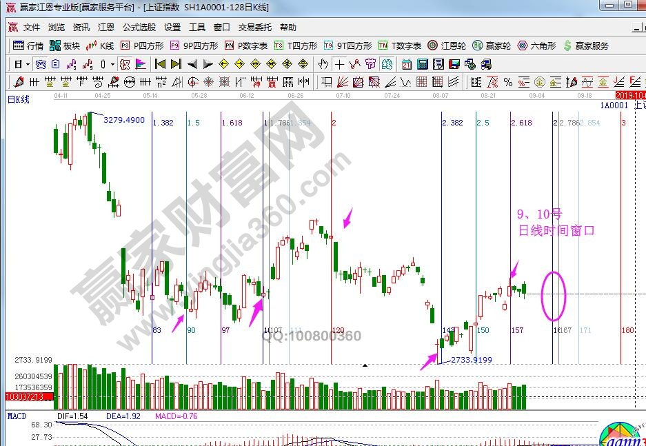 ☆依據贏家江恩理論系統(tǒng)江恩黃金時間周期線提示:以2019年1月4號(2440點)為起點,2019年4月8號(3288點)為終點做圖,9(10)號、16號、27號時間窗口。