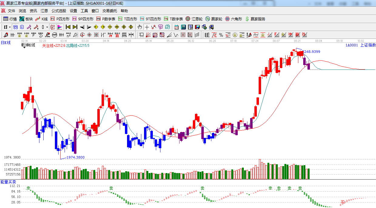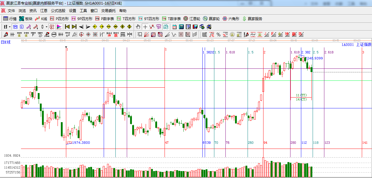 ☆依據(jù)贏家江恩系統(tǒng)乾坤K線提示:紫色十字星,紫色k線代表警示,破位紅色關(guān)注線,短期如不能收復(fù),波段看空。
