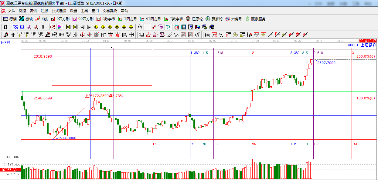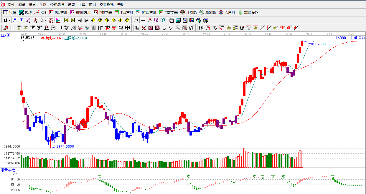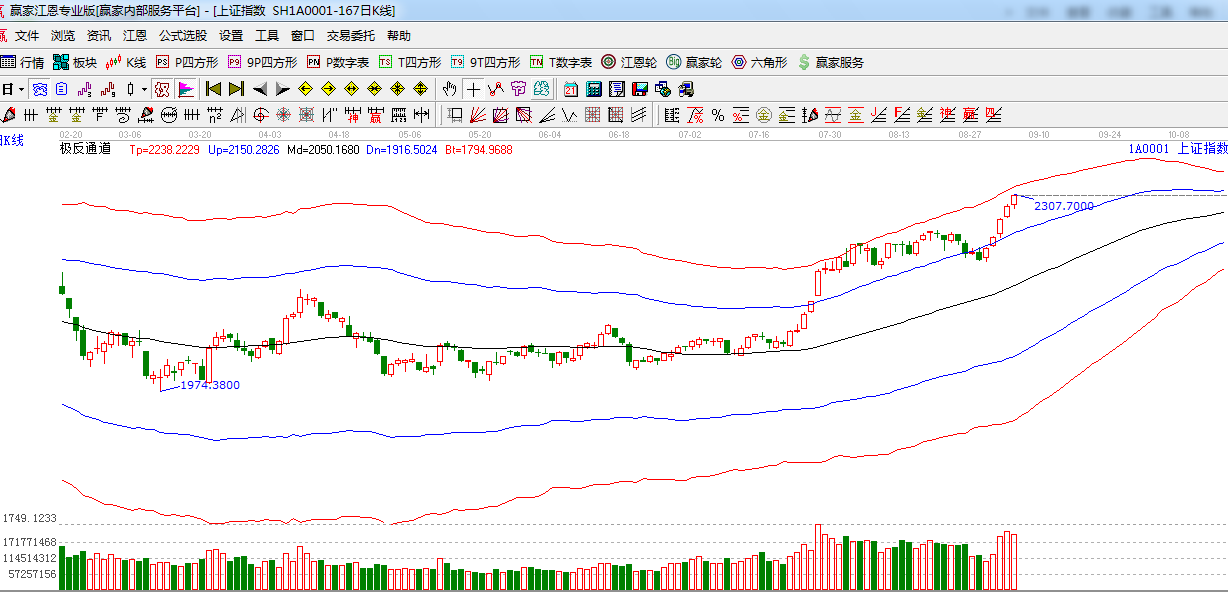 江恩看盤綜述:依據(jù)贏家江恩技術(shù)工具分析得出:兩市再創(chuàng)新高,一舉突破2300點(diǎn)關(guān)口,成交量繼續(xù)放大,由于上方接近極反通道外軌線,預(yù)計(jì)短期震蕩上行更可能成為后市主基調(diào)。阻力區(qū)間2300-2318附近,今日是9.5日時(shí)間之窗。