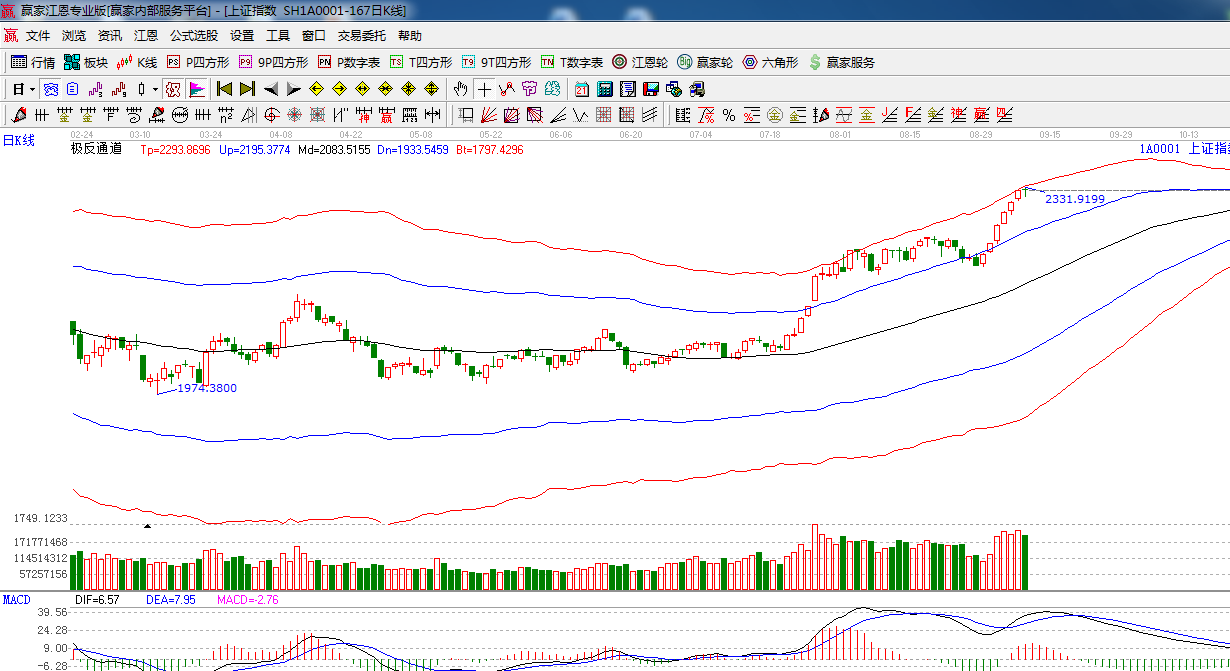 江恩看盤綜述:依據(jù)贏家江恩技術(shù)工具分析得出:指數(shù)受外軌線壓制,兩市窄幅震蕩,十字星報收,大盤由逼空轉(zhuǎn)向區(qū)間整理,上方2340強阻力,預(yù)計今日沖高回落仍以高位震蕩為主,操作上,合理控制倉位,做好高拋低吸。