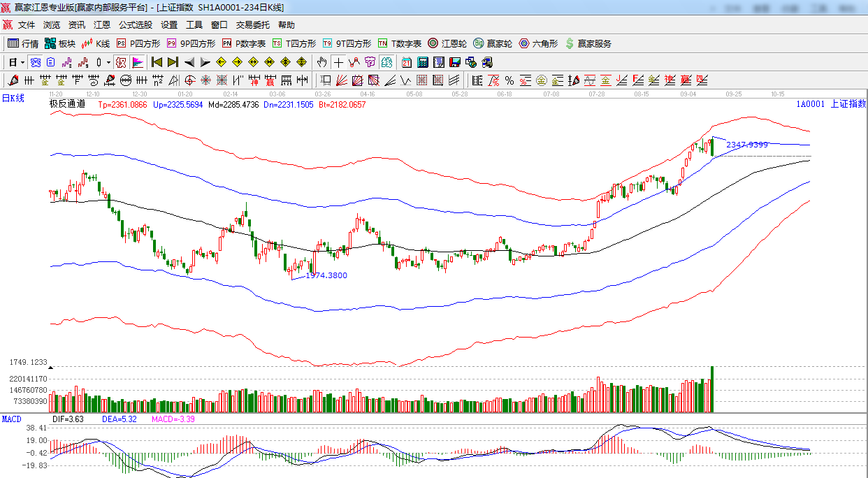 極反通道提示:外軌線之下沖高回落,中陰線報(bào)收,謹(jǐn)慎為主。