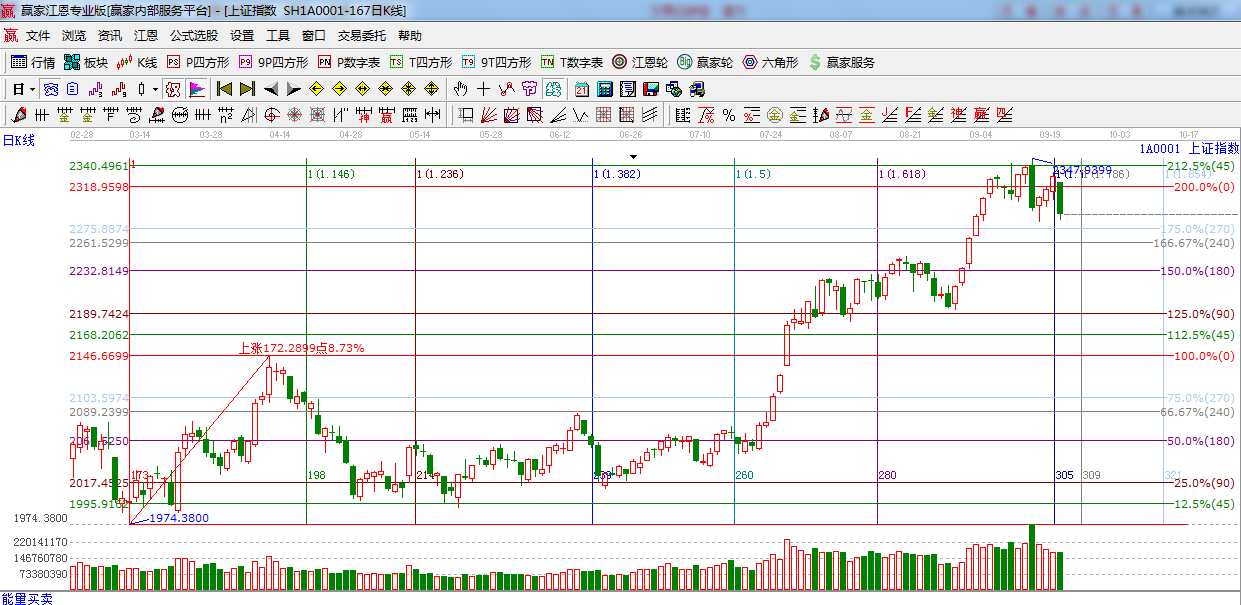 江恩看盤(pán)綜述:依據(jù)贏家江恩技術(shù)工具分析得出:前期分析中提到的周五最后一小時(shí)選擇短線方向,今日如期應(yīng)驗(yàn),開(kāi)盤(pán)后一路調(diào)整中陰報(bào)收,尾盤(pán)略有收窄,整體量能保持縮量態(tài)勢(shì),預(yù)計(jì)明日指數(shù)沖高回落,短期仍有下調(diào)空間,下方第一目標(biāo)關(guān)注2261附近。操作,適當(dāng)降低倉(cāng)位,做好活動(dòng)倉(cāng)調(diào)整。