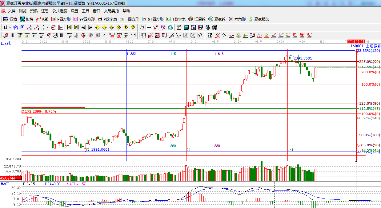 ☆依據(jù)贏家江恩系統(tǒng)黃金時(shí)間周期線提示:下一重要時(shí)間窗口是11月24日附近。