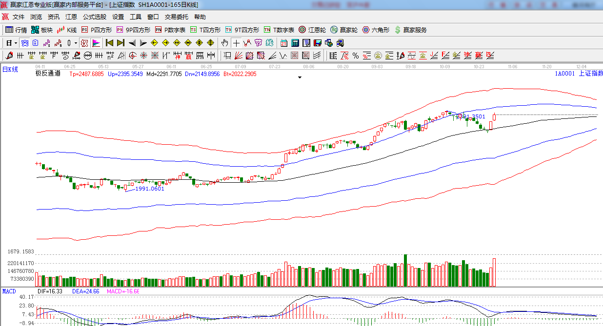 極反通道提示:受消息影響,指數(shù)繼續(xù)放量上行,上方阻力是在2410點,短線謹慎看多。