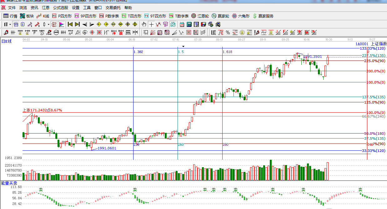 周三滬深兩市早盤雙雙高開,小幅整理后延續(xù)上漲趨勢,盤中突破90度2360點,最高沖擊江恩135度2381點后小幅回落,截至收盤,滬指報收2373.03點,上漲35.16點,漲幅1.50%,成交2251億元;深成指報8090.68點,上漲102.34點,漲幅1.28%,成交2322億元。