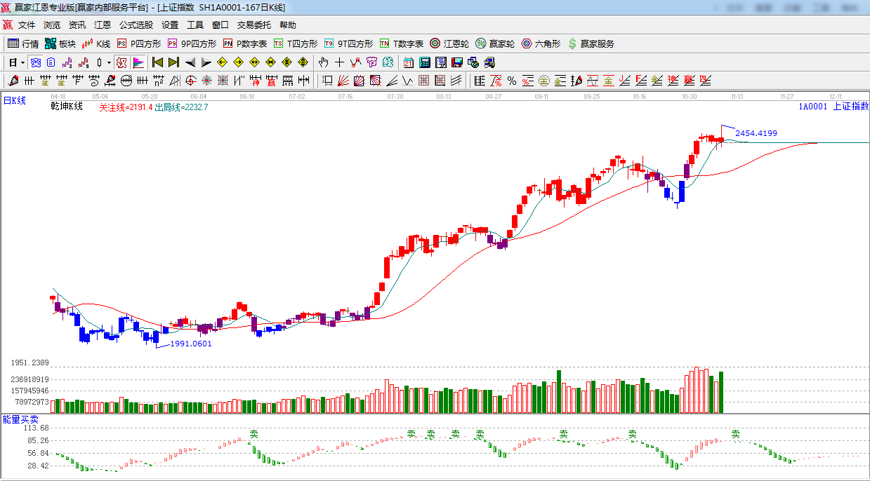 ★依據(jù)贏家江恩系統(tǒng)乾坤K線提示:回踩綠色出局線,短期謹(jǐn)慎為主。