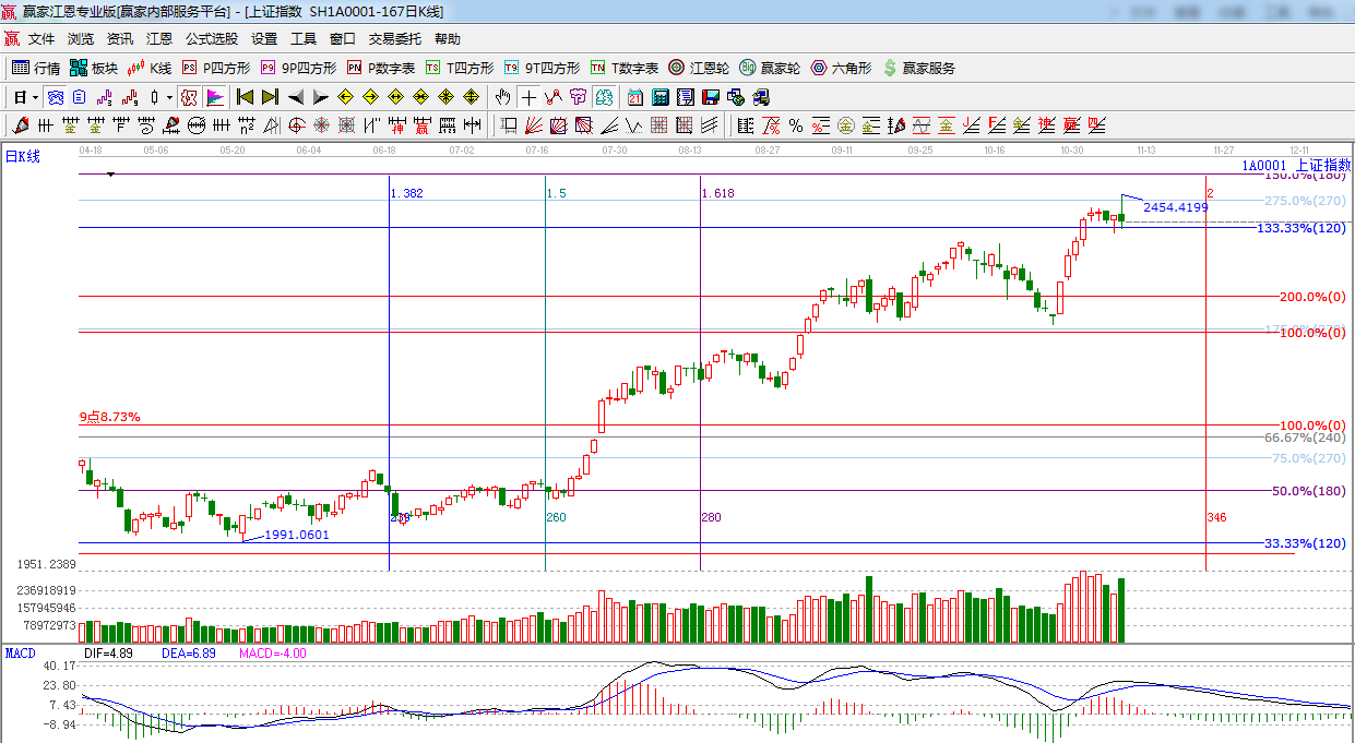 ☆依據(jù)贏家江恩系統(tǒng)波段百分比提示:指數(shù)沖高回落,下方支撐依然是120度2410點(diǎn),前起頭部2391點(diǎn),上方阻力180度是2480點(diǎn)。