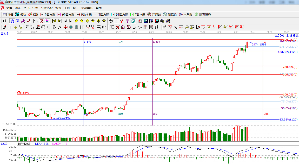 ☆依據(jù)贏家江恩系統(tǒng)黃金時(shí)間周期線提示:重點(diǎn)關(guān)注時(shí)間窗口是11月24日。
