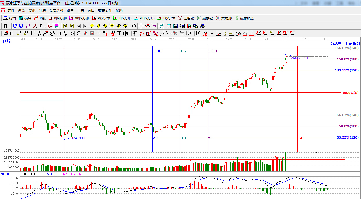江恩看盤綜述:依據(jù)贏家江恩技術(shù)工具分析得出:上證指數(shù)低開高走,以中陽線報收,收復江恩180度2480點,但量能較昨日大幅減少,后期若無量能跟隨,短期維持在2500點附近形成強勢震蕩行情難以避免,短線依然留意180度2480點的得失,本月重要時間窗口在11月24日。