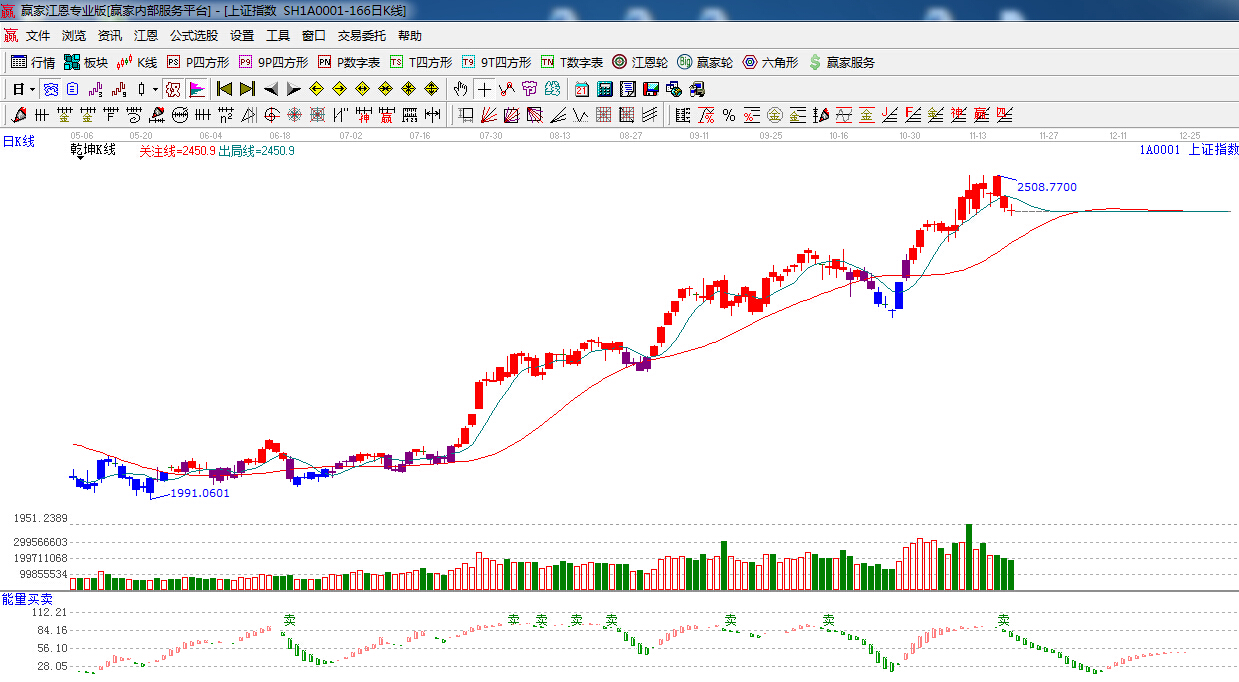 ★依據(jù)贏家江恩系統(tǒng)乾坤K線提示:紅色區(qū)域,破位短線出局線,短線看空,波段看多。