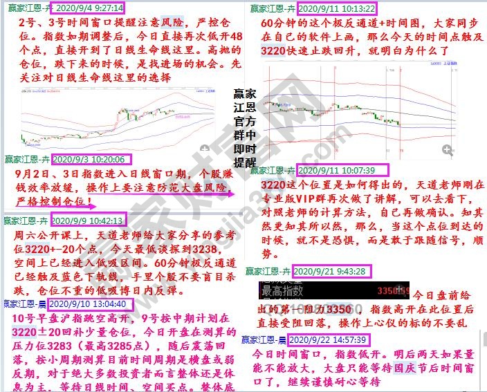 2020年一季度大盤反復摔打創(chuàng)年內(nèi)低點2646點、二季度小碎步攀升、三季度強勢上攻隨后轉(zhuǎn)入修整,四季度行情拉開序幕、蓄勢待發(fā)。8、9月份市場在箱體區(qū)間內(nèi)運行,贏家江恩團隊在正式學員群提前給出箱體策略,原話如下“在一個箱體區(qū)間里做滾動交易--底倉+活動倉,不會輕易的去追漲,而是對持續(xù)跟蹤的標的(日或周強勢區(qū)域)調(diào)整幾天后用活動倉參于,上漲到別人想追時賣出?!?/span>學員可在群中搜索“箱體”回顧提出時間進行思考,為何能提前于市場走勢之前就提出相應的策略?當你你又是如何打算的呢?后知后覺者永遠是賣單者,大家看看自己的賬戶,是不是9月份把今年賺的都還給市場了,其中應該不少人8月份就還了利潤,9月份還虧了本金。如這樣都不能讓你明白,擁有一套“投資體系”的重要性,那再來一波牛市,賺的錢最終也不是你的。如果你跟隨專業(yè)的團隊進行學習,在9月初2號、3號時間窗口,提醒降低倉位時控制倉位,不僅保住了利潤還可以根據(jù)工具信號在9月11日3220時價點做一個反彈,同樣贏家江恩團隊提前測算出3350壓力,9月底指數(shù)再探3200附近,分鐘圖再現(xiàn)時價四方信號。