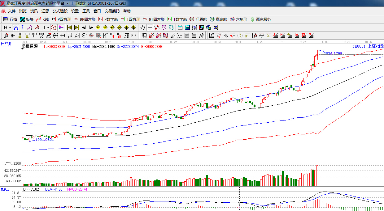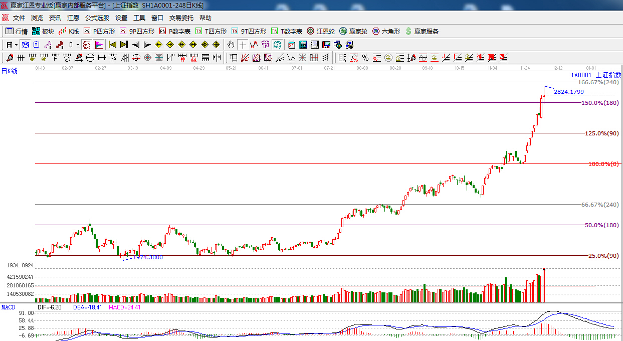 江恩看盤綜述:依據(jù)贏家江恩技術(shù)工具分析得出:,大盤昨日一度沖擊江恩240度線附近,終盤十字星報(bào)收,成交量再度創(chuàng)出歷史新高,權(quán)重和題材形成鮮明反差,預(yù)計(jì)短期高位震蕩。下方支撐關(guān)注180度2743點(diǎn)。