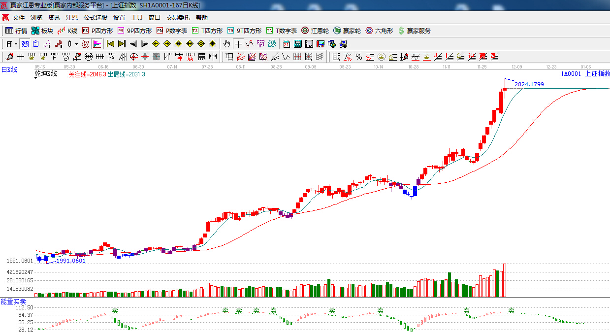 周三兩市紛紛高開高走,券商繼續(xù)維持強(qiáng)勢(shì),大盤一度沖擊江恩240度線附近,成交量明顯放大,午后權(quán)重集體跳水,題材股全面而上,終盤以放量十字星報(bào)收,盤面上,隨著券商板塊走勢(shì)的分化,有色板塊全面爆發(fā),多只個(gè)股漲停,另外,體育,軍工改制等有所表現(xiàn),創(chuàng)業(yè)板午后一改前期弱勢(shì)全線大漲,市場(chǎng)二八風(fēng)格進(jìn)一步加劇,權(quán)重和題材形成鮮明反差,今日市場(chǎng)之中的成交量可謂再度創(chuàng)出歷史新高,十字星報(bào)收,預(yù)計(jì)短期高位震蕩。下方支撐關(guān)注180度2743點(diǎn)。
