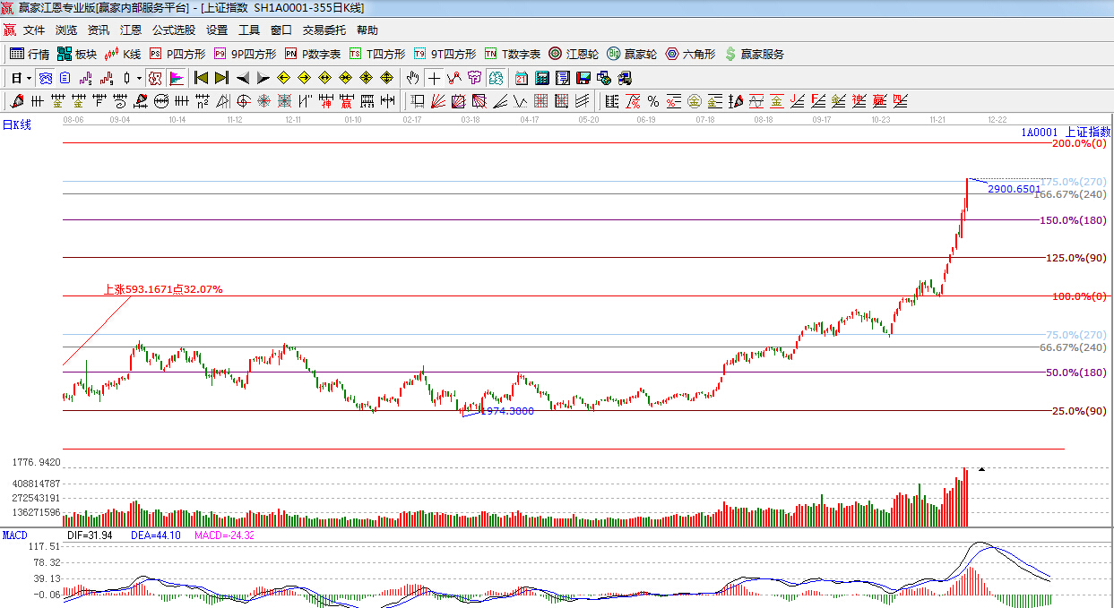 江恩看盤綜述:依據(jù)贏家江恩技術(shù)工具分析得出:滬深兩市繼續(xù)保持逼空式上漲,放量突破江恩三分位240度線,此 位置轉(zhuǎn)換為支撐,回踩不破將會(huì)繼續(xù)向上拓展空間,上方0度位置3034點(diǎn),目前只要券商不倒,大盤就能繼續(xù)上漲,操作 上,后市繼續(xù)關(guān)注反彈中漲幅落后的低估藍(lán)籌。