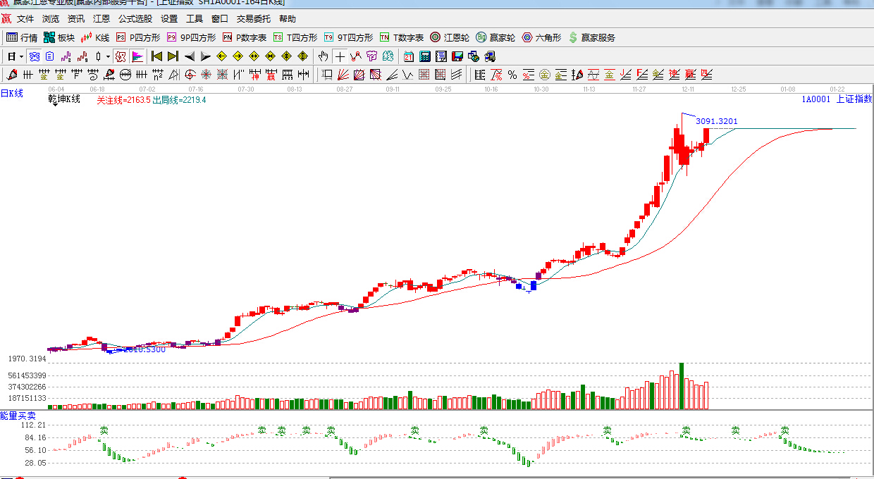 ★依據(jù)贏家江恩系統(tǒng)乾坤K線提示:紅色區(qū)域,綠色出局線之上,趨勢看多。