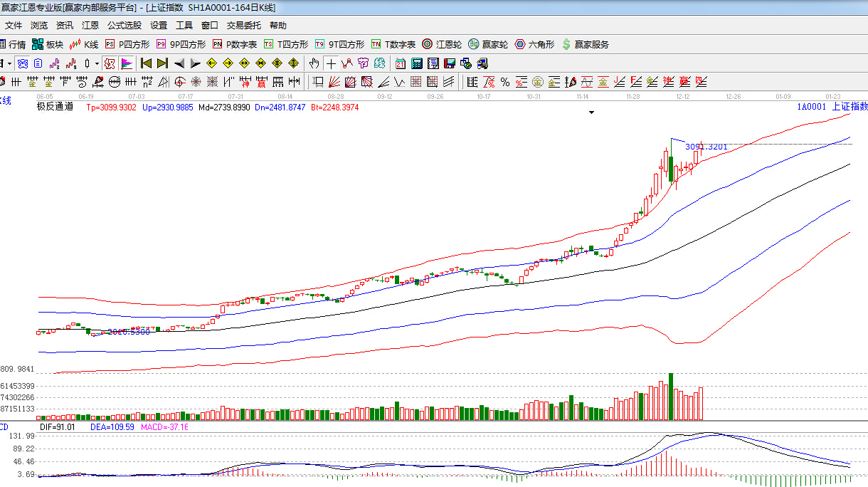 極反通道提示:指數(shù)沿紅色外軌線,繼續(xù)震蕩走高,依據(jù)規(guī)則外軌線不破,整體看多趨勢(shì)不變。