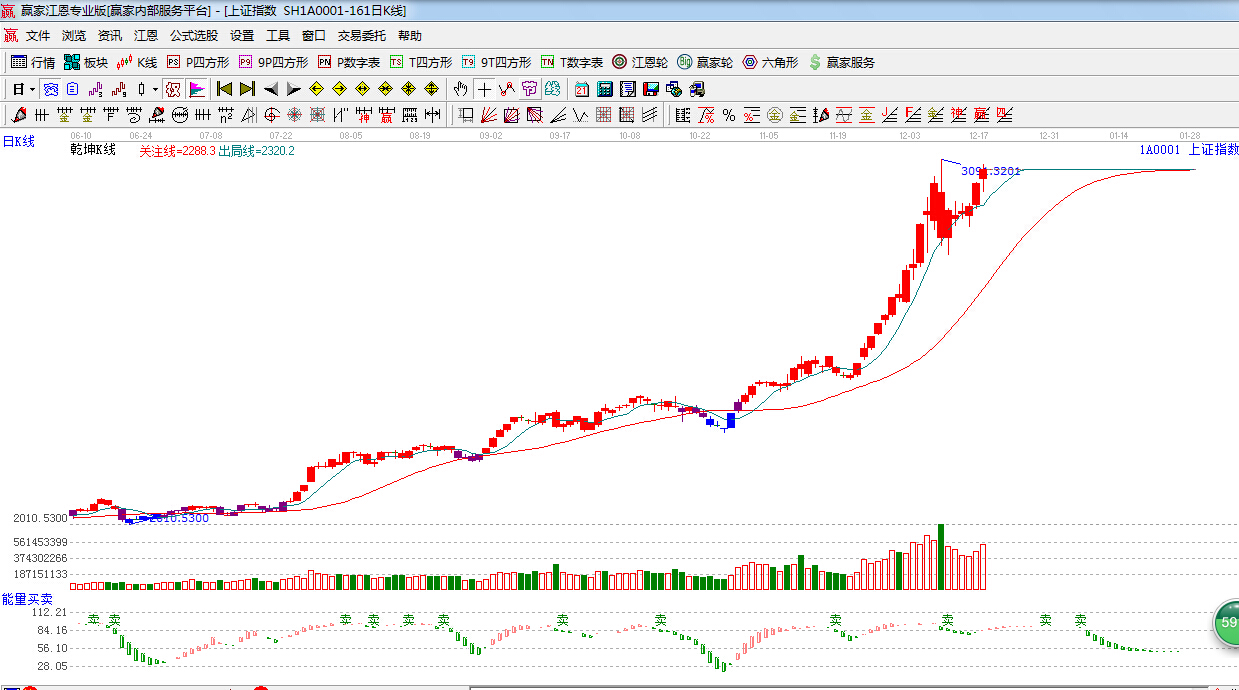 ★依據(jù)贏家江恩系統(tǒng)乾坤K線提示:紅色區(qū)域,綠色出局線之上,趨勢(shì)看多
