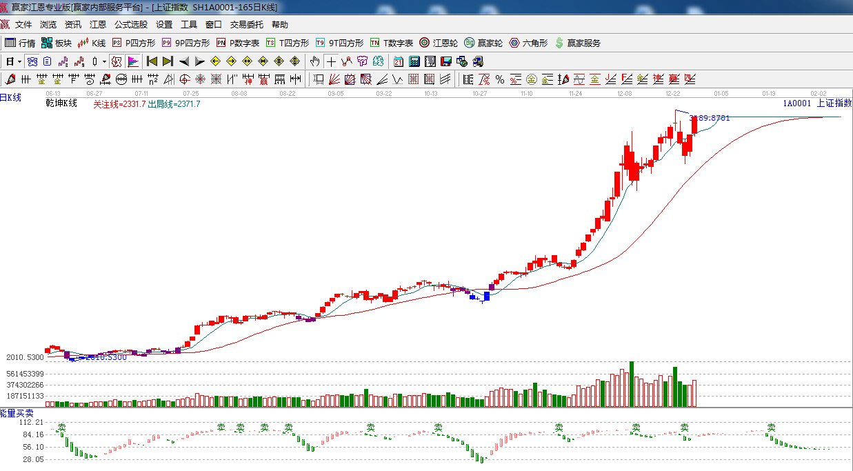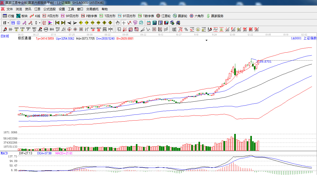 極反通道提示:日K線收盤在紅色外軌線上,短周期15、30分鐘到達(dá)極反通道強(qiáng)勢外軌線附近,盤中觀察盤整時各周期關(guān)系做好倉位的調(diào)控?! ?br />