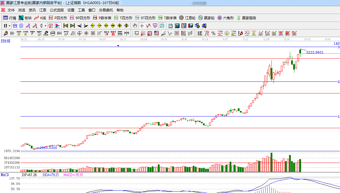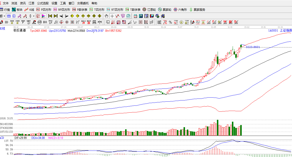 周一早盤滬指高開近2%,在保險、地產、銀行、一帶一路等板塊帶動下最高沖擊3223.86點,創(chuàng)出近五年新高,臨近尾盤,隨著權重板塊的回落指數一度翻綠,創(chuàng)業(yè)板指數低開低走最大跌近50點,破1500點關口,盤面上,保險、地產、廣東自貿、白酒等漲幅居前,智能家居、送轉潛力、計算機應用、網絡完全、互聯網金融等跌幅居前,技術面,早盤滬指沖高回落,尾盤回踩江恩0度支撐位回升,量能方面呈量價背離形態(tài),明日繼續(xù)關注江恩0度3114點支撐,此位置不破,短期上升趨勢不變,破位短線看空,預計短期指數高位震蕩為主,操作上已不宜盲目追高。