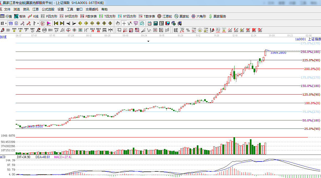 江恩看盤綜述:依據(jù)贏家江恩技術(shù)工具分析得出:今日2015年首個(gè)交易日A股實(shí)現(xiàn)“開門紅”,突破了江恩180度阻力,回踩不破,繼續(xù)看高,下一目標(biāo)位重要?dú)v史高點(diǎn)3478點(diǎn),也是目前的江恩240度位置,操作上,藍(lán)籌股依然是炒作的主流,另外國資改革概念也可適當(dāng)逢低關(guān)注。
