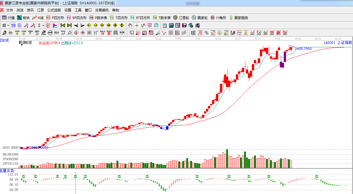 ★依據(jù)贏家江恩理論系統(tǒng)乾坤K線提示:1月21日由紫色k線轉(zhuǎn)入紅色區(qū)域,看多。