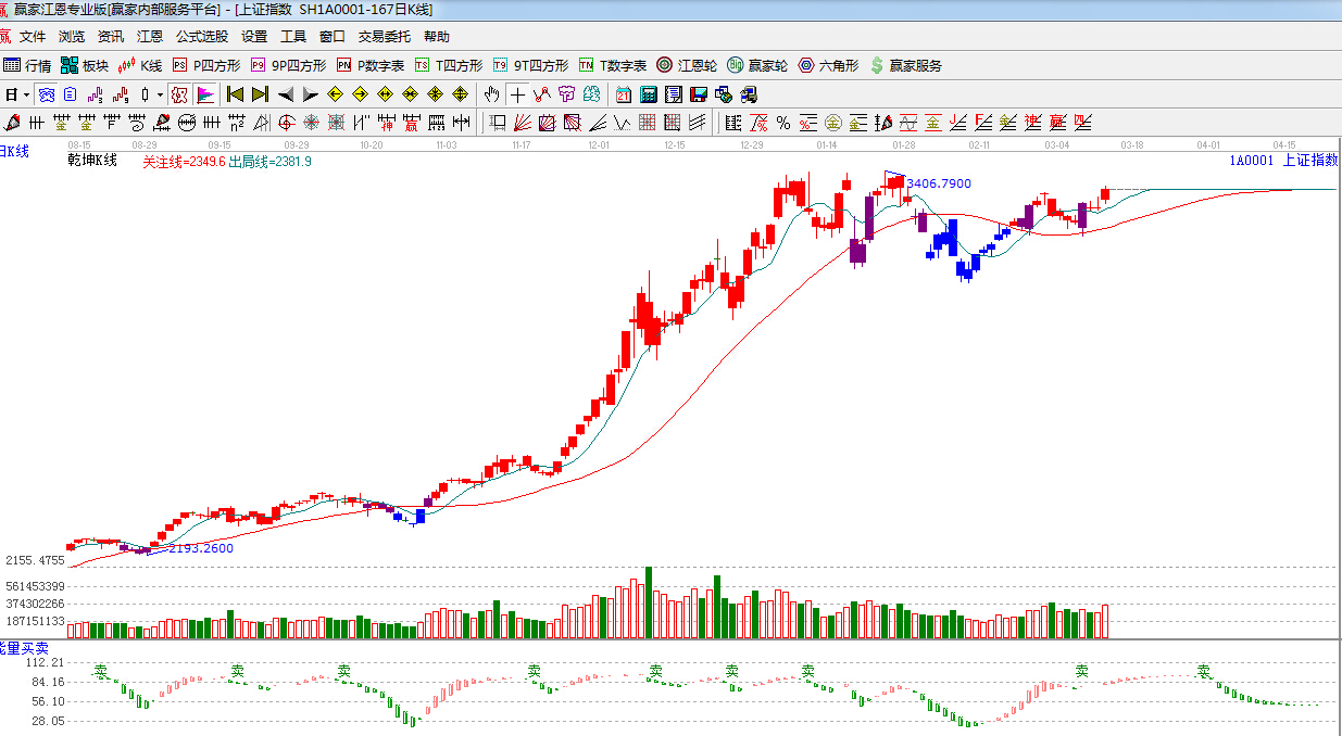 ★依據贏家江恩理論系統(tǒng)乾坤K線提示:紅色k線,短線出局線之上,紅色關注線之上,看多。