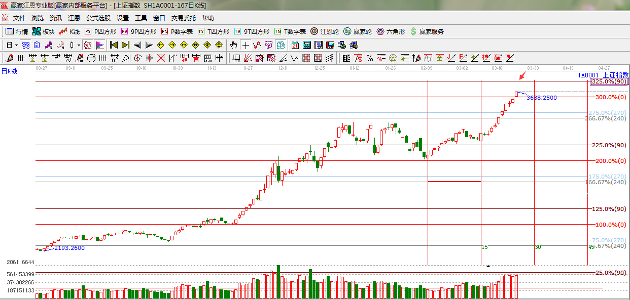 江恩看盤(pán)綜述:依據(jù)贏家江恩技術(shù)工具分析得出:早盤(pán)滬指跳空高開(kāi)突破江恩0度位置,之后一路震蕩走高,市場(chǎng)盤(pán)面強(qiáng)勢(shì)不改,滬指上行同時(shí)伴隨成交量快速回升,顯示本輪行情的上行走勢(shì)并未改變,依據(jù)江恩工具分析,上方下一個(gè)阻力將是江恩90度位置3783點(diǎn)附近。操作上,逢低關(guān)注國(guó)資改革、年報(bào)超預(yù)期個(gè)股,對(duì)于短線急漲的個(gè)股要控制好倉(cāng)位。