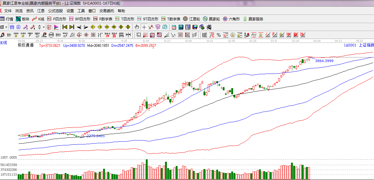 極反通道提示:上方紅色外軌強(qiáng)勢(shì)區(qū)域,震蕩攀升,短期謹(jǐn)慎為主。