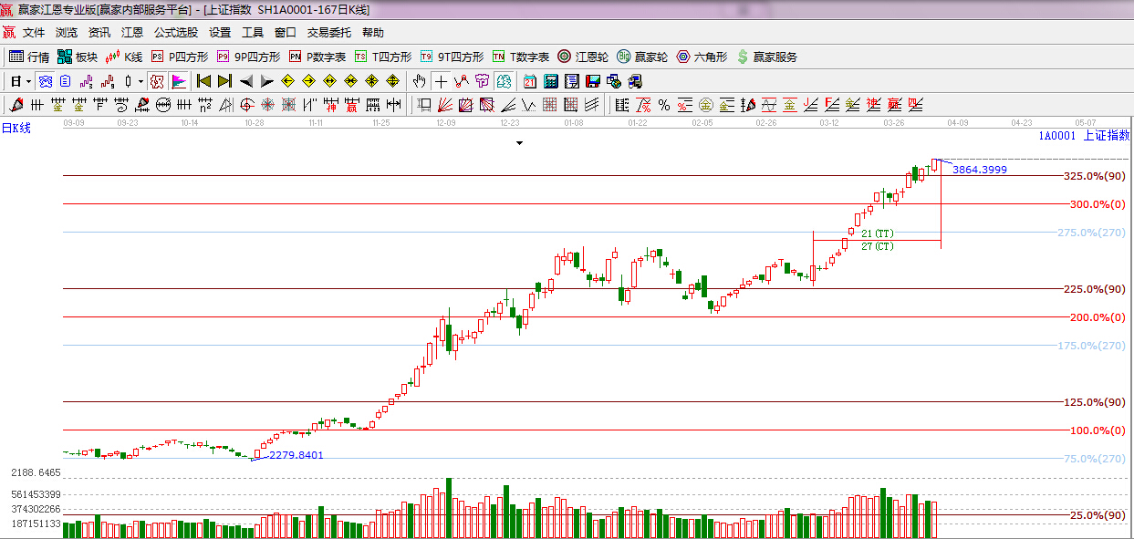 ★依據(jù)贏家江恩理論系統(tǒng)波段百分比提示:今日回踩江恩90度3783點(diǎn)附近,繼續(xù)震蕩攀升,依據(jù)規(guī)則下一目標(biāo)位是江恩270度4081點(diǎn)。