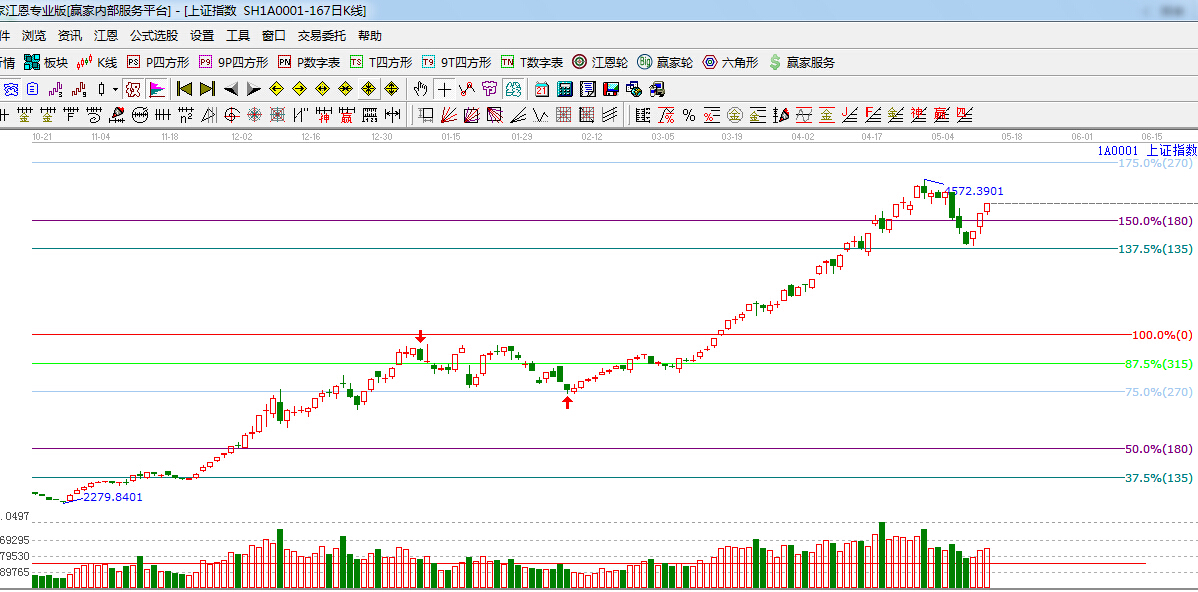 ★依據(jù)贏家江恩理論系統(tǒng)波段百分比提示:滬指如期在江恩135度4088點附近,止跌回升,突破180度4300點,180度轉(zhuǎn)換為支撐位置。