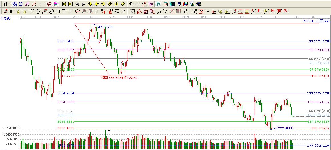 ☆依據(jù)贏家江恩系統(tǒng)工具——極反通道提示:大盤周五跌破極反通道生命線2088點(diǎn),趨勢轉(zhuǎn)弱,不可操作。