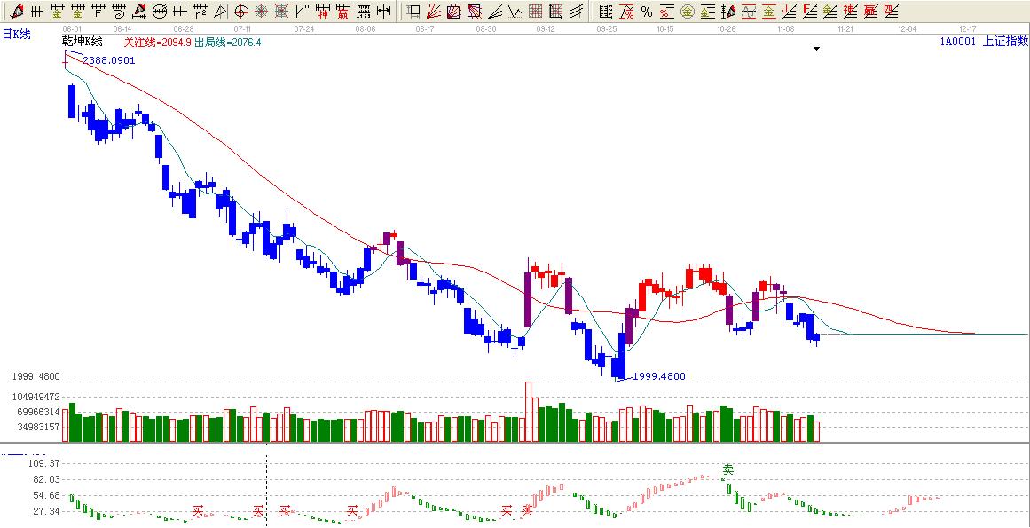 ☆依據(jù)贏家江恩系統(tǒng)乾坤k線提示:大盤處于藍(lán)色區(qū)域,多看少做。