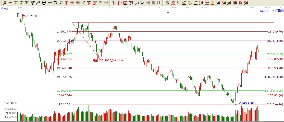 綜上所述:大盤短期315度位置2270構成短期強支撐。極反通道紅色上軌2353第一壓力。