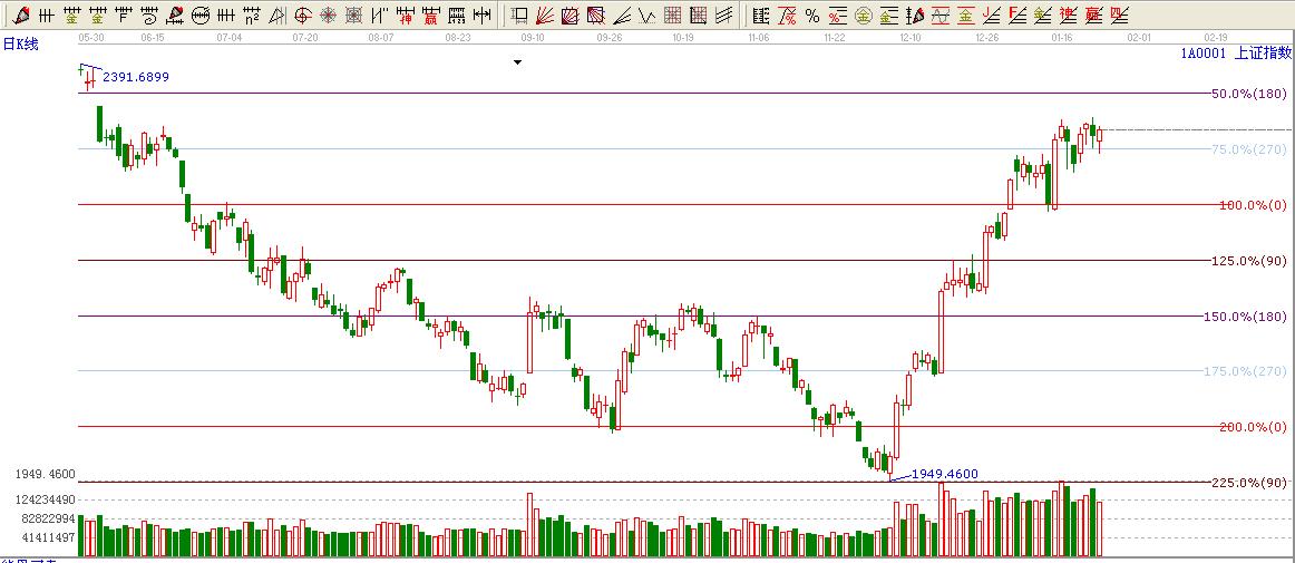 ★依據(jù)贏家波段百分比伸線提示:大盤(pán)270度位置2303附近再一次震蕩上行,上方依然是180度位置2360壓力。270度不破看高一線。