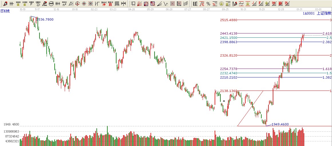 綜上所述:大盤極反通道藍色上軌位置不破,按照極反通道應用法則看高一線至2457點,短期黃金分割2.382/2.618位置震蕩難免。