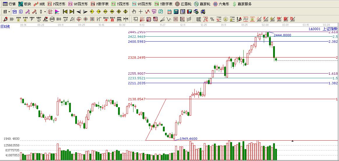 ☆依據(jù)贏家黃金價(jià)格延伸線提示:大盤如期跌至黃金分割延伸線2倍位置,短期構(gòu)成壓力,這里不過(guò)看低一線至1.618位置2255附近.