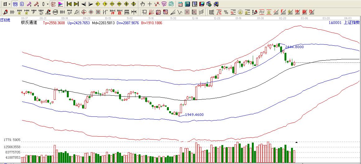 綜上所述:大盤處于極反通道生命線2288點附近,按照極反通道應用法則極反通道生命線不破看高一線至2433點藍色上軌位置。