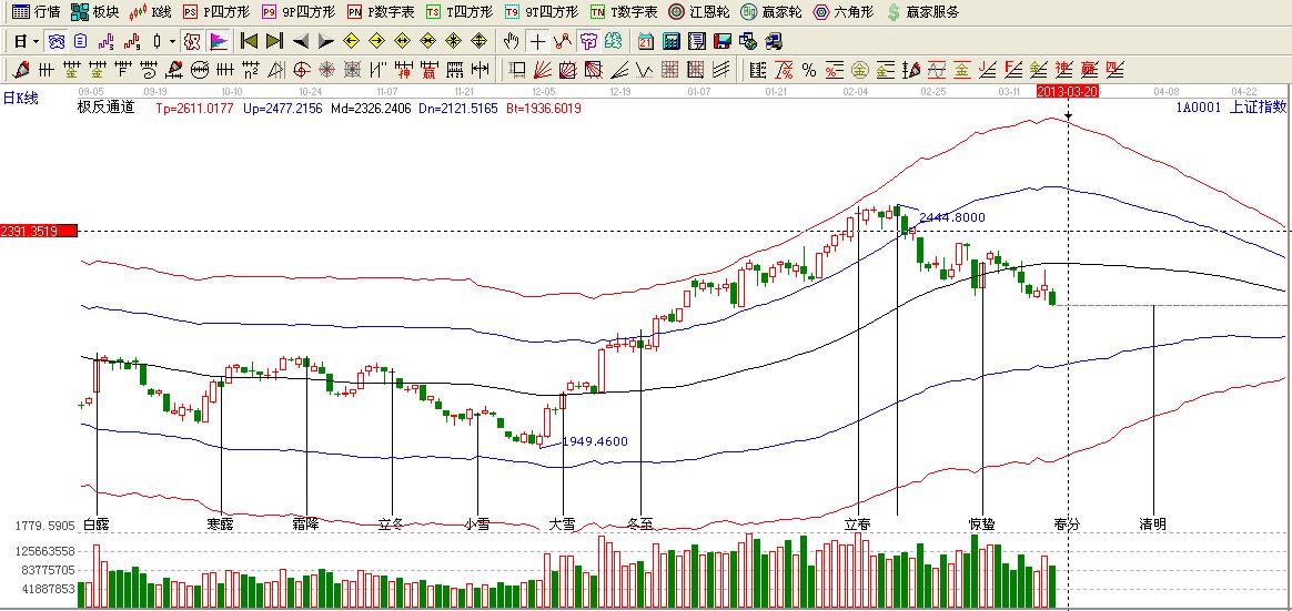 ☆依據(jù)贏家江恩系統(tǒng)極反通道提示:大盤處于極反通道生命線2326.5點下方,看空