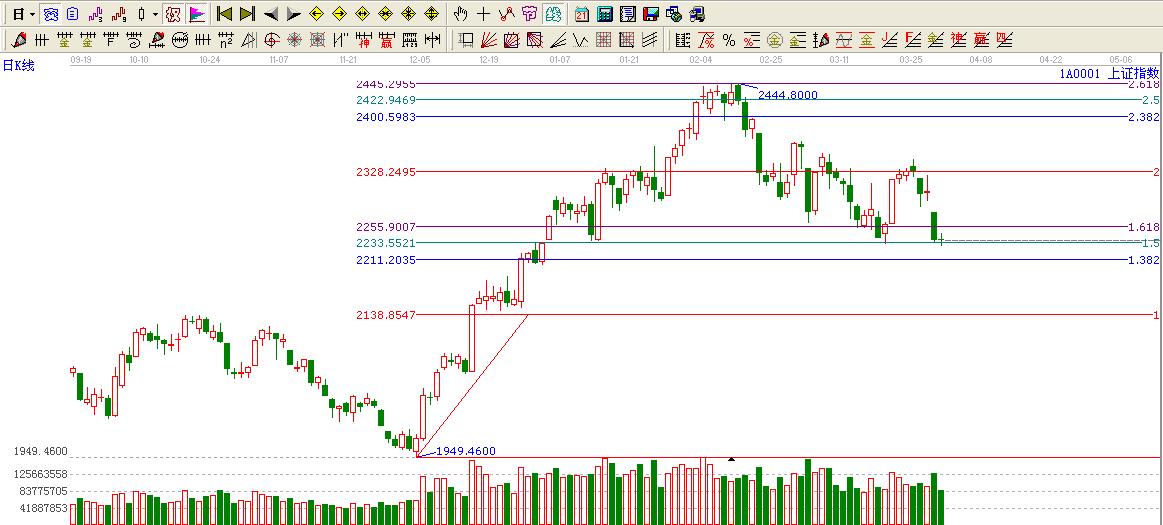 ★依據(jù)贏黃金價格延伸線提示:大盤再度考驗黃金分割延伸1.5位置2230附近支撐,一旦破位持續(xù)看空至黃金分割延伸線1.382位置2210附近。只有上行在1.618位置才會見2328點附近。
