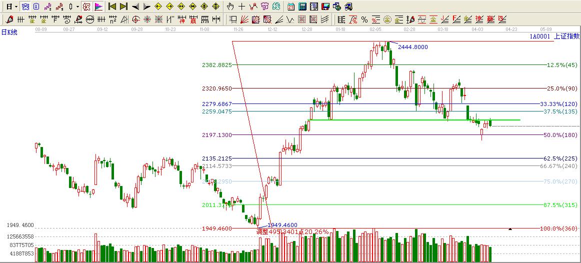 ★依據(jù)贏波段百分比提示:大盤1949.46點至2444.80點回調(diào)目前處于180度位置2197.13點上方,這里不破看高一線至135度位置2259.04點