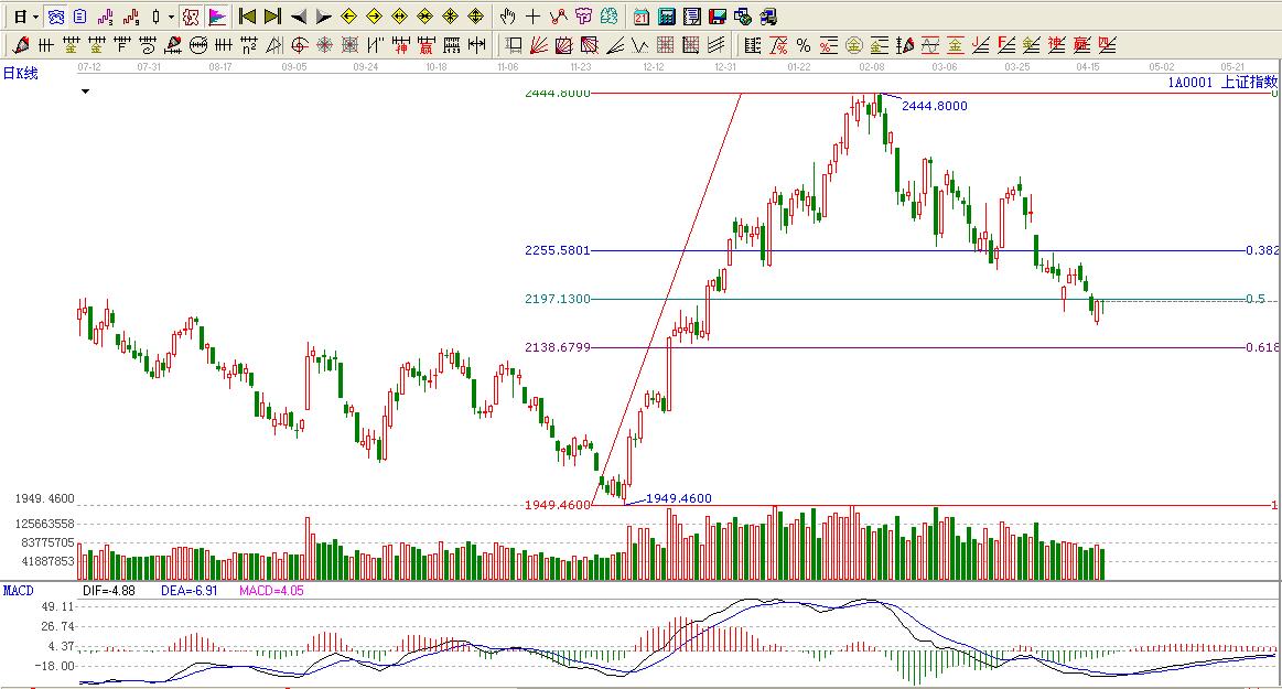 綜上所述:大盤處于低點(diǎn)1949.46點(diǎn)至高點(diǎn)2444.80點(diǎn)回調(diào)0.5黃金分割位置,只有上行至0.5位置上方才會(huì)觸摸0.382位置2255.58點(diǎn)。否則還是震蕩下行為主。