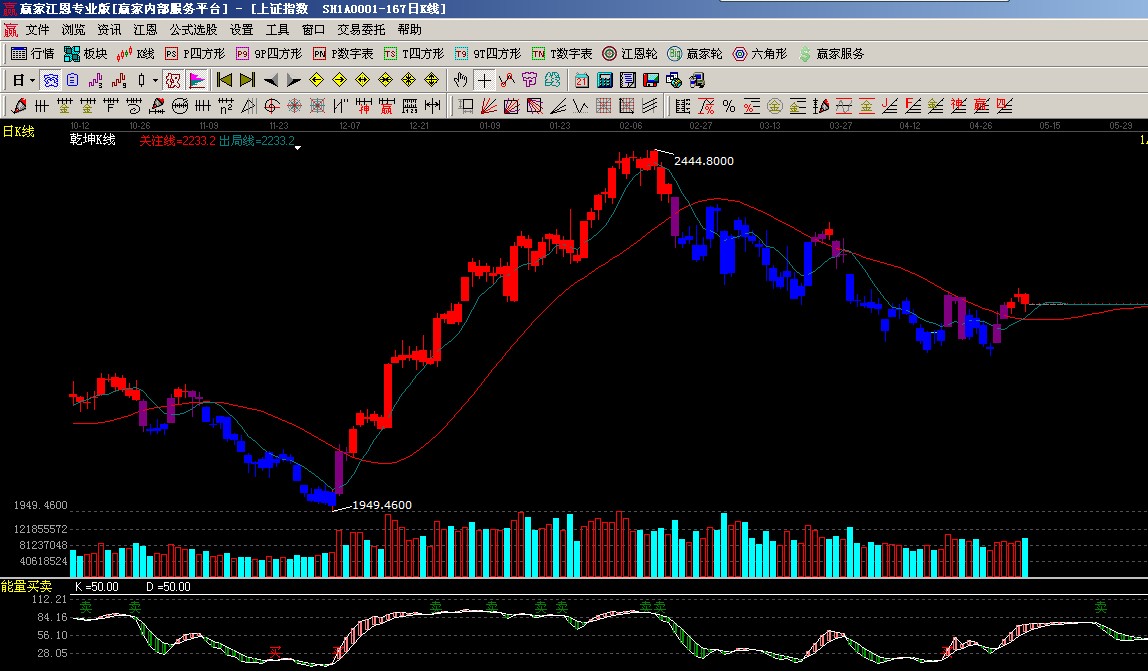 ★依據(jù)贏家乾坤k線提示:出局線上穿關(guān)注線K線為紅色,收盤(pán)不破關(guān)注線看多,如圖(1);