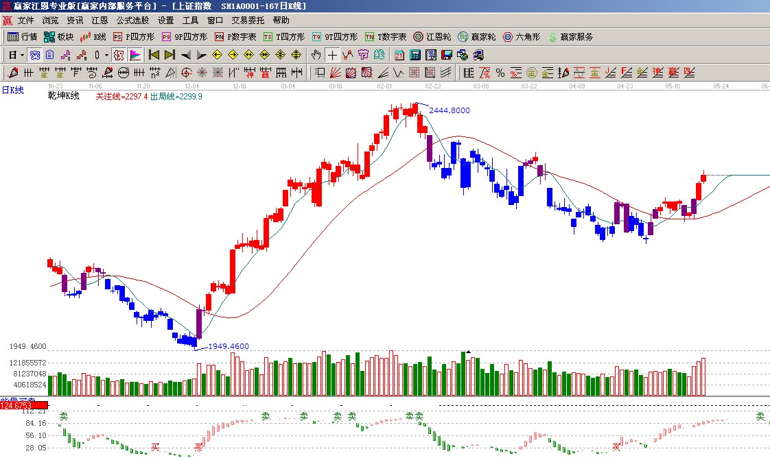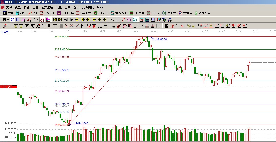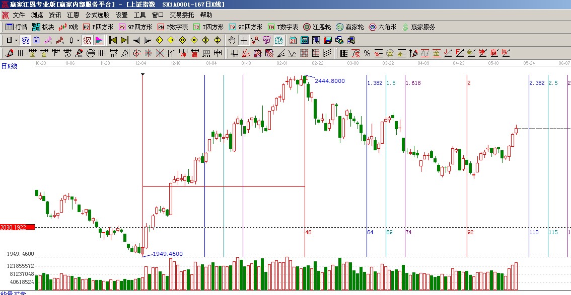 ☆依據(jù)黃金時間周期線提示:從1949點至2444點做時間圖(3),5月23號為時間窗;