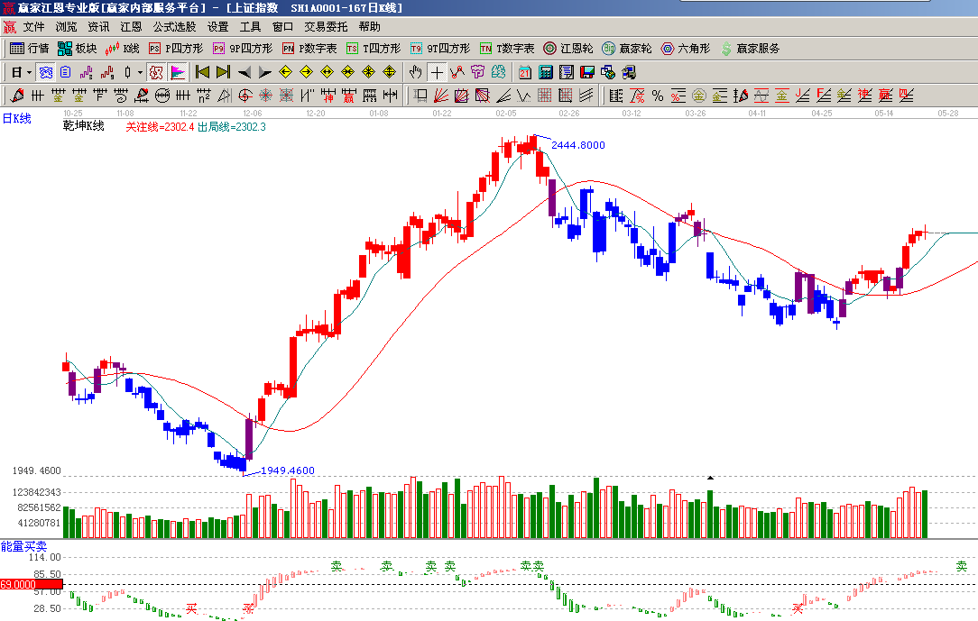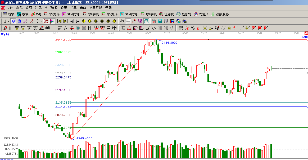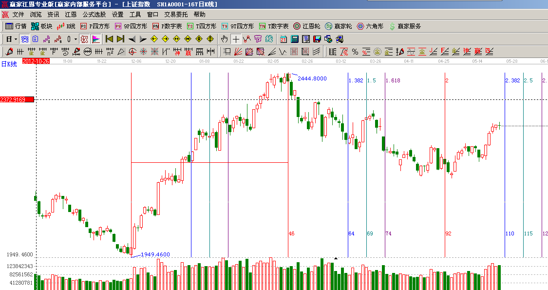 ☆依據(jù)黃金時間周期線提示:從1949點至2444點做時間圖(3),5月23號為時間窗;