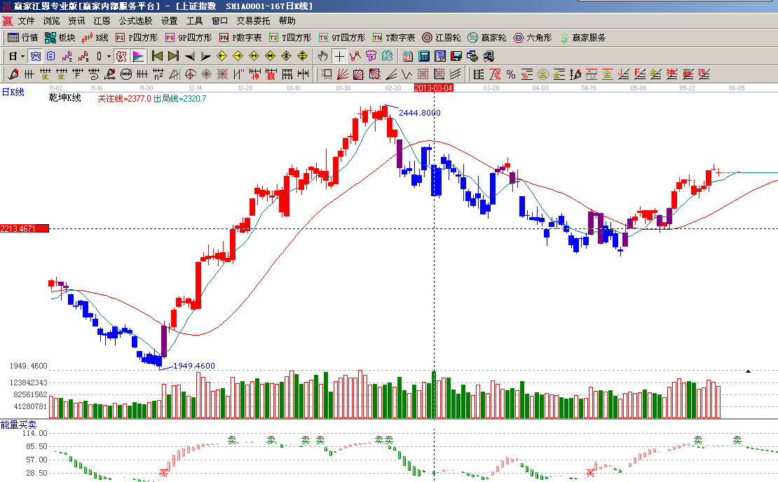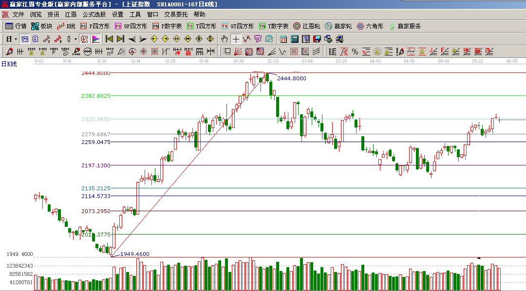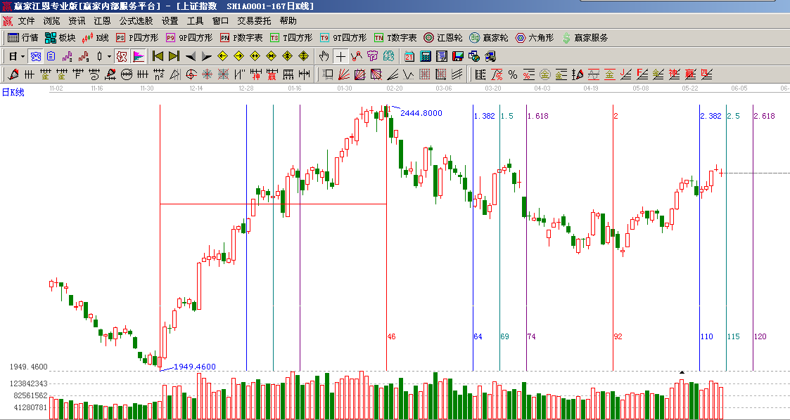 ☆依據(jù)贏家江恩系統(tǒng)黃金時間周期線提示:從1949點(diǎn)至2444點(diǎn)做時間圖(3),5月31號為時間窗;