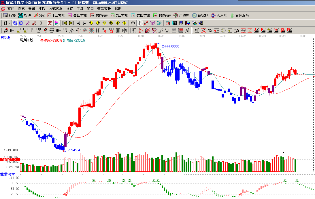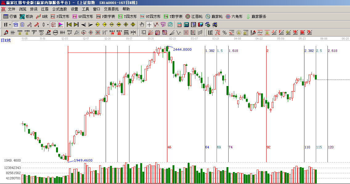 ☆依據(jù)贏家江恩系統(tǒng)黃金時(shí)間周期線提示:從1949點(diǎn)至2444點(diǎn)做時(shí)間圖(3),6月7號(hào)為時(shí)間窗;
