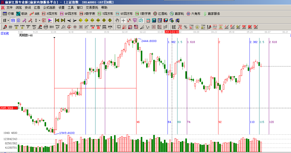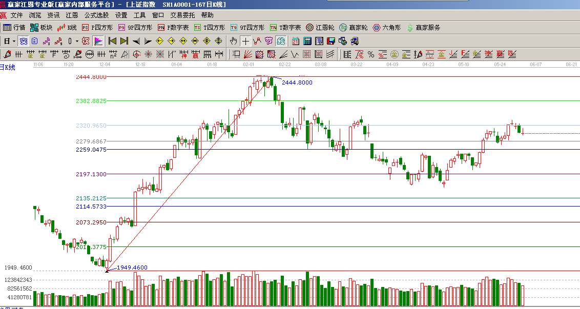 ☆依據(jù)贏家江恩系統(tǒng)黃金時間周期線提示:從1949點至2444點做時間圖(3),6月7號為時間窗;